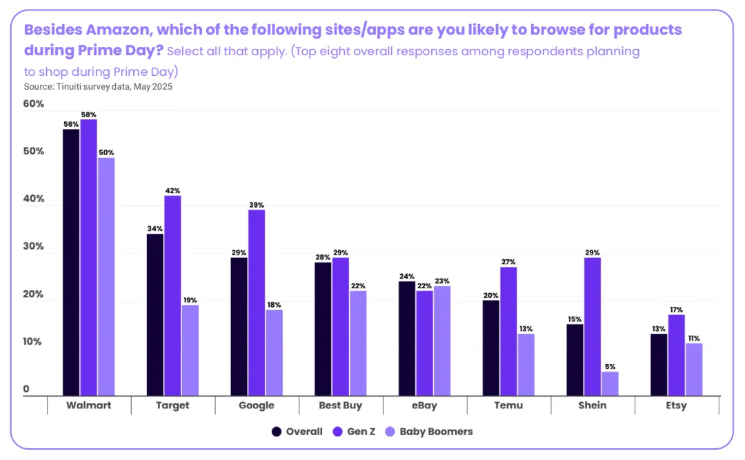 Tinuiti调研显示,超过一半(52%)的Prime会员计划在活动期间浏览沃尔玛的产品进行比价,其次是Target(34%)和谷歌(29%)。
