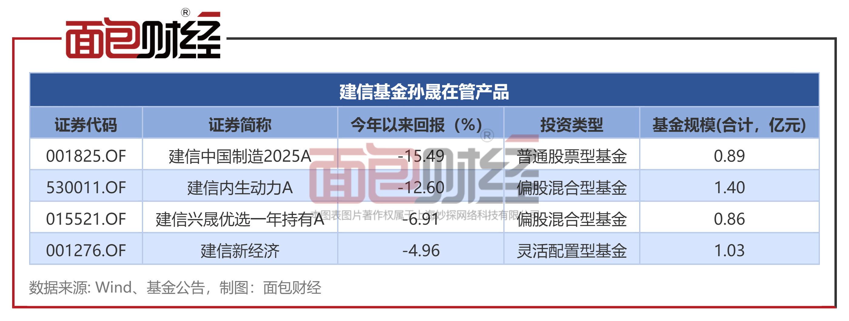 建信内生动力的基金经理孙晟于2013年6月加入建信基金。目前,孙晟在管4只产品(初始基金口径),上述产品合计规模约4.18亿元。