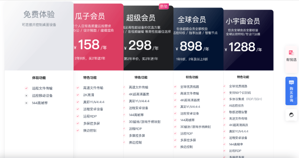 免费版只有远程文件传输功能,广告和牛皮癣一样多,综合体验差意思。但各个会员版做的还是蛮别致的,还有专适合跨境工作者的全球会员版,功能配备考虑的也算较为周到。不过鉴于有高频、长期远程控制的人群不算太广再加上发展策略偏保守,所以向日葵近年来是有被其他家超越的趋势。