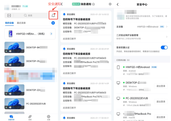 安全性方面也极为突出、优越,其中登录/连接二次验证这一行业内首创模式可以称为是ToDesk最安全的核心依据。这是相当于在登录和连接过程中多一道手机端确认的验证步骤,确保只有授权用户能够访问目标账户及设备,这意味着每一次连接使用者本人都知悉且同意,能够充分避免电脑出现因曾不慎透露双码信息被莫名控制的情况!