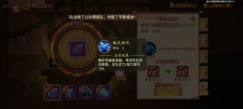 第七个共鸣技能效果各不相同,点击图标即可查看(未激活也可查看),例如曹操的共鸣技能可提升全队武力和智力15%(见图9)。