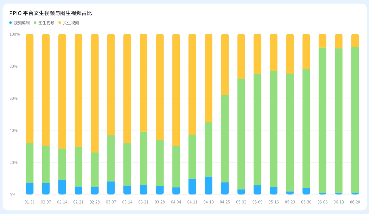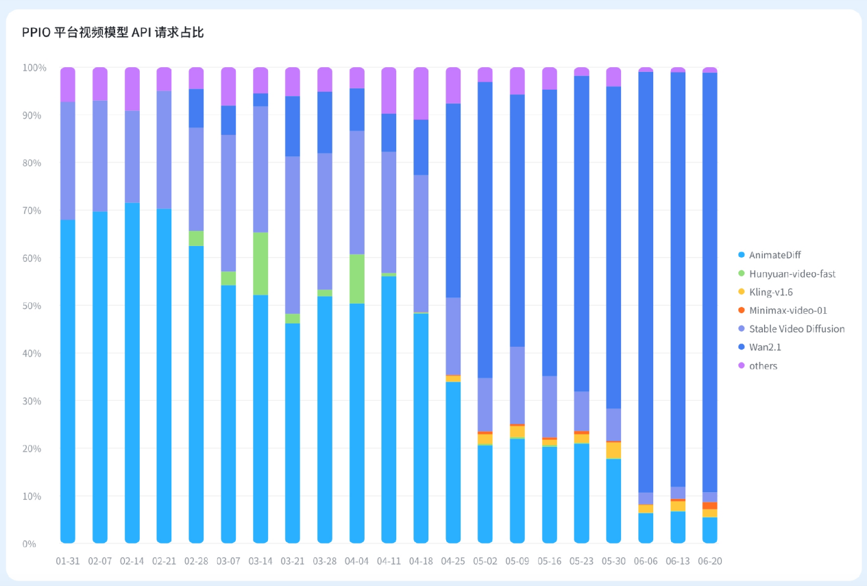 从 3 月份开始,腾讯的开源视频模型 Hunyuan Video 与阿里的开源视频模型 Wanxiang(万相)上线后,国内开源视频模型开始高速增长。到 6 月份,阿里 Wanxiang 使用量占全平台的 80%以上,成为 PPIO 平台最受欢迎的国产视频开源模型。