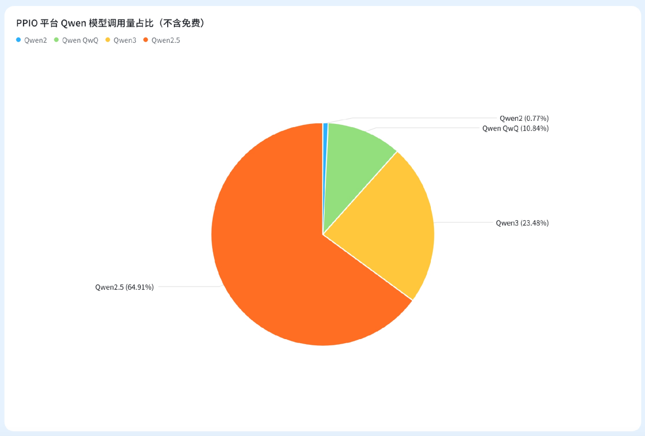 在 PPIO 平台的 Qwen 模型中,最受欢迎的是 Qwen2.5。PPIO 在 4月下旬针对 Qwen2.5-7B-instruct 等模型开放限时免费活动,该系列模型的 tokens 消耗激增,整体消耗占 Qwen 系列整体的 90% 以上。即使在 Qwen3 发布后,Qwen 2.5 依然保持了强劲的用户需求。