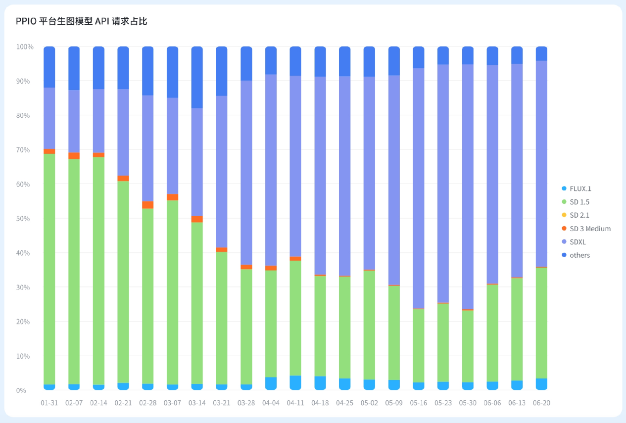Flux.1 模型的整体占比在 3% 左右,未见有明显的增长。