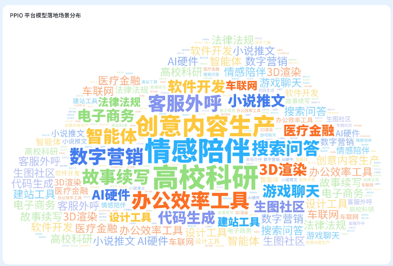 在 PPIO 平台。情感陪伴类应用、创意内容生产类工具、办公效率类工具以及高校科研项目是对 AI 最大需求方。