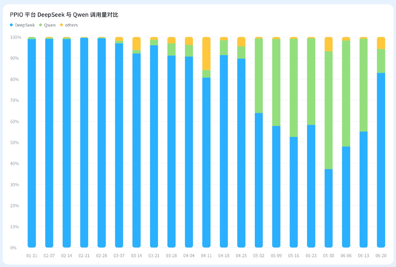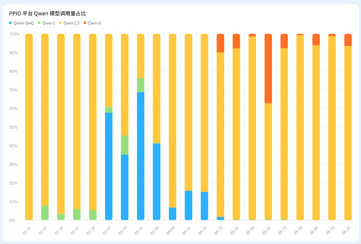 Qwen 就是其中的一个代表。PPIO 目前上线了 Qwen 的三个系列——Qwen2、Qwen2.5 和 Qwen3,前两者是 2024 年发布的模型,Qwen3 在今年 4 月 29 日首发上线 PPIO 。从 2025 年第二季度开始,PPIO 平台的 Qwen 模型的使用量开始高速增长,到 5 月下旬时调用量占比超过一半,最高时达 56%,与 DeepSeek 一同称为最受欢迎的两大开源模型。