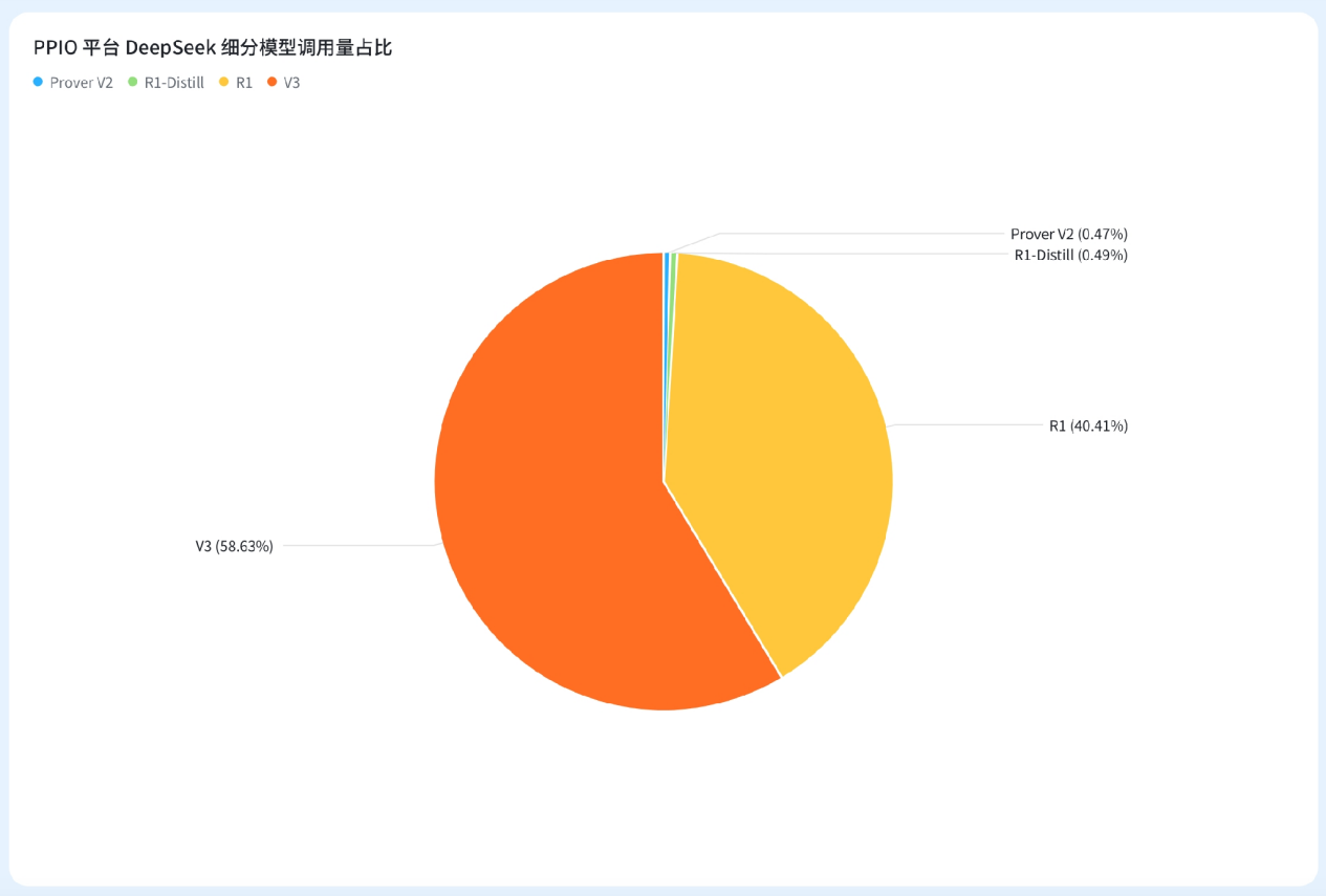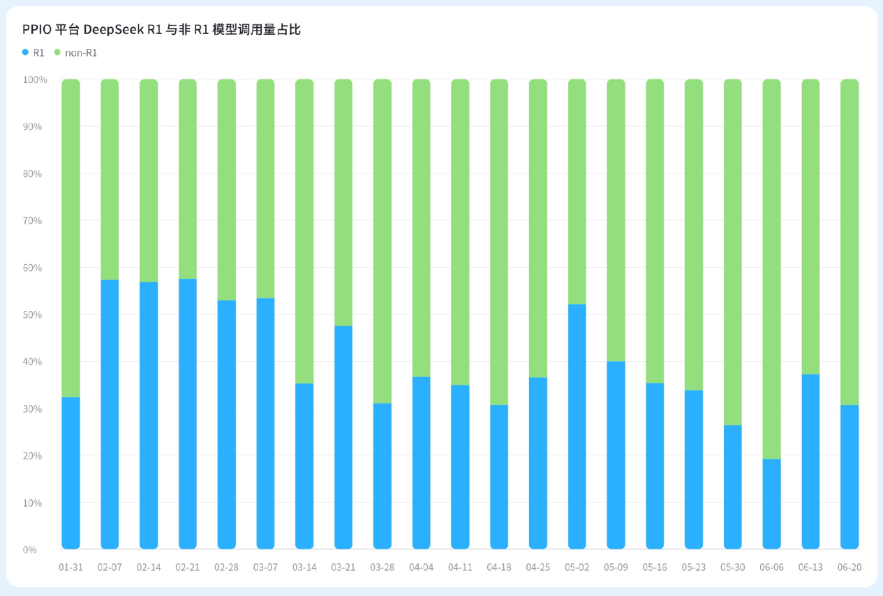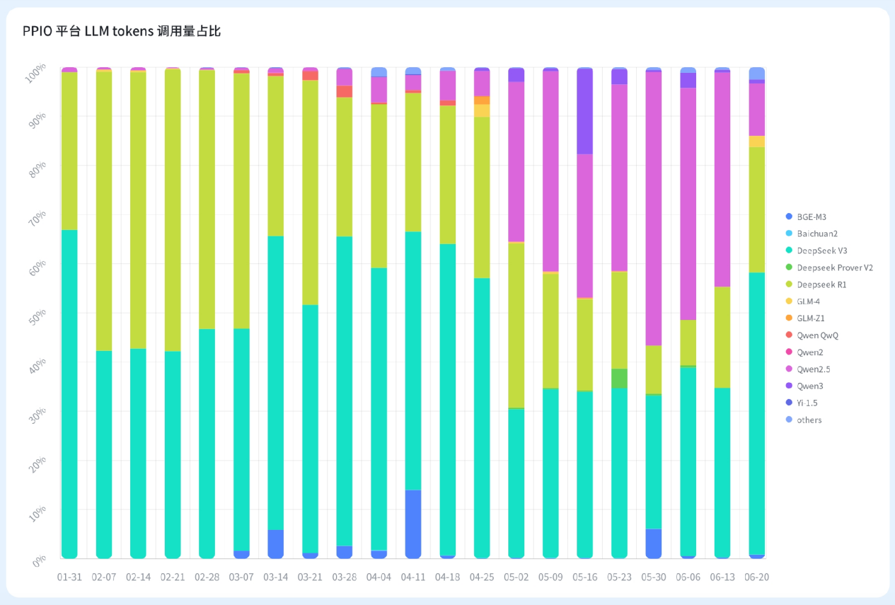 DeepSeek 有两个大版本,一是 base 模型 V3,首发于 2024 年 12 月,并在 2025 年 3 月 24 日发布更新版本;二是推理模型 R1,首发于 2025 年 1 月,并在 2025 年 5 月 28 日发布更新版本。2025 年第一季度,DeepSeek 模型一枝独秀,在 PPIO 的使用占比高达 99%。直到 5 月份后,DeepSeek 的使用量占比开始有所下降,主要是因为更多优秀模型出现,用户对于模型的选择更加多元化了。