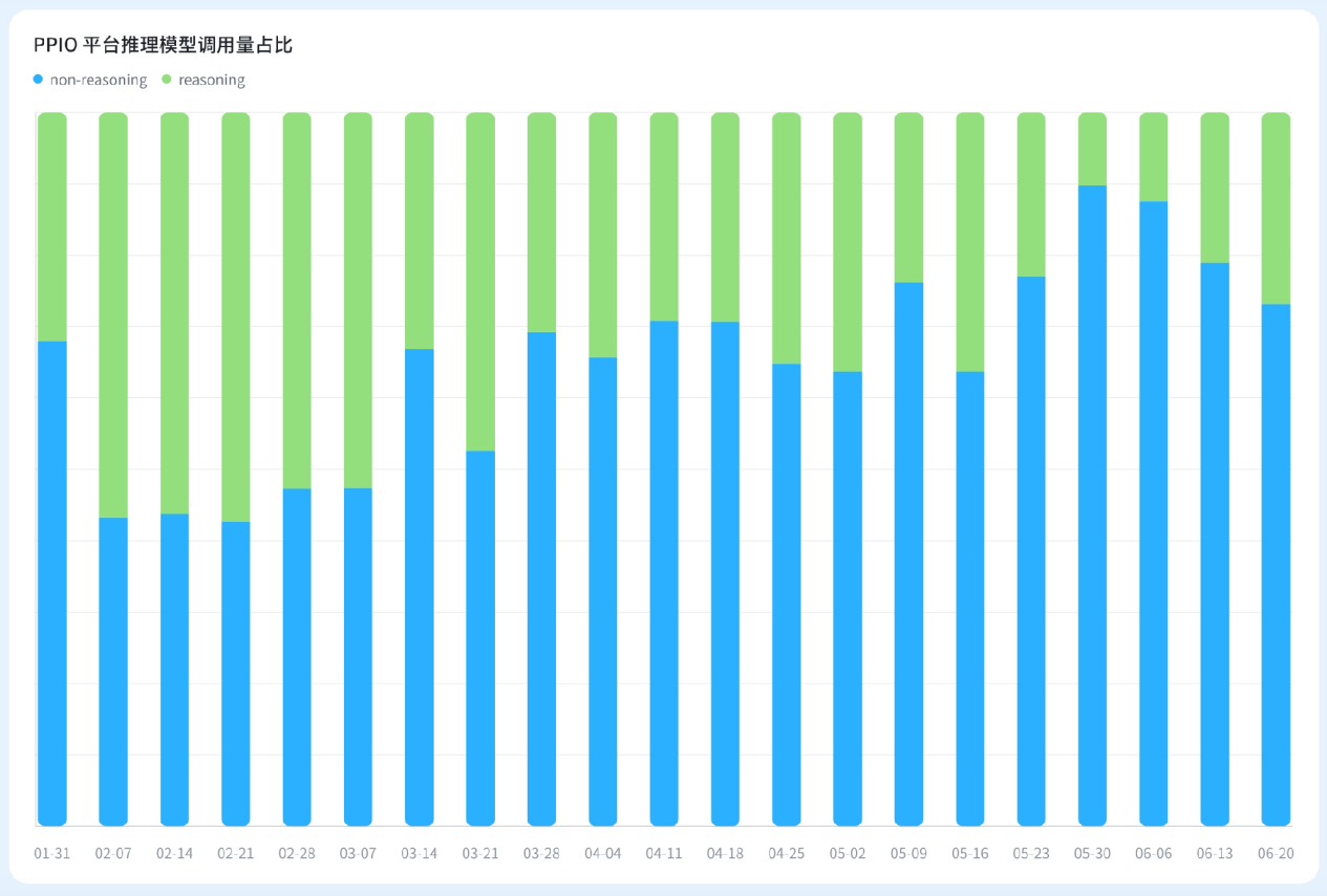 2025 年 2 月份,推理模型受到广大 AI 开发者的青睐,其全平台的使用量占比保持在 50% 以上。但从 3 月份开始,非推理模型的使用量反超推理模型,并一直延续至今。