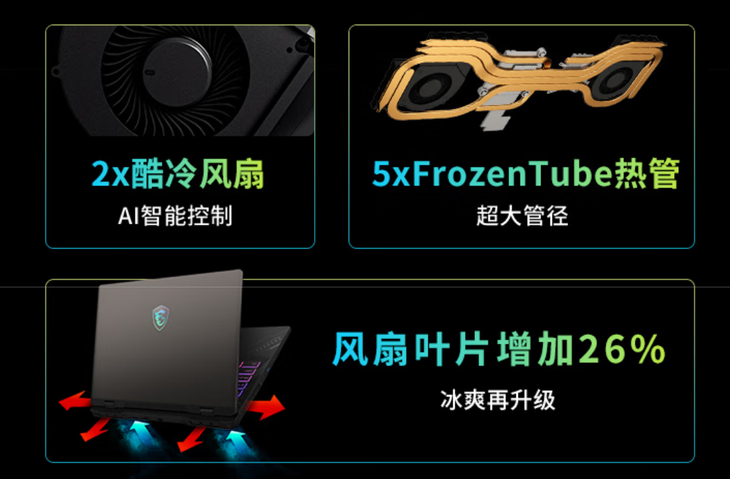 得益于全新散热架构以及多出风口的设计,微星神影16锐龙版2025在散热方面表现出色。内置双酷冷风扇,CPU与GPU共享5热管,热管直径更粗,配合微星独家散热硅胶,可以确保核心部件的性能稳定。CPU与GPU的双烤可以实现190W的性能释放,满足玩家对于高性能的追求。