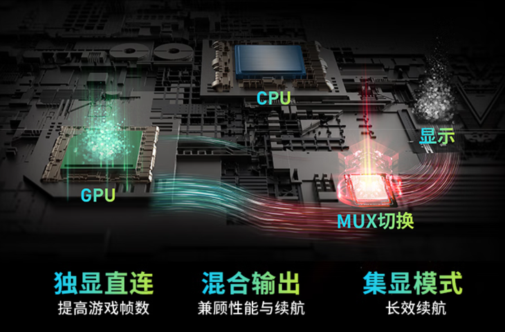 微星神影16锐龙版2025还支持MUX双显三模切换技术,支持独显直连、混合输出以及极限模式,从而满足用户不同场景的需求。