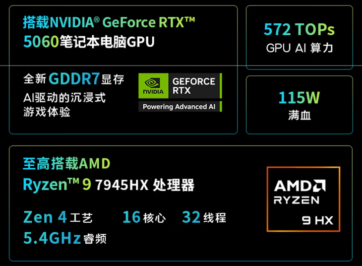 显卡方面采用的RTX5060笔记本电脑GPU,基于NVIDIA Blackwell架构,拥有8GB显存,3328个CUDA核心,可以实现572TOPS AI算力,满功耗性能115W,得益于DLSS 4的支持在游戏上的表现也十分优秀,能够实现高画质与高帧率的游戏效果。