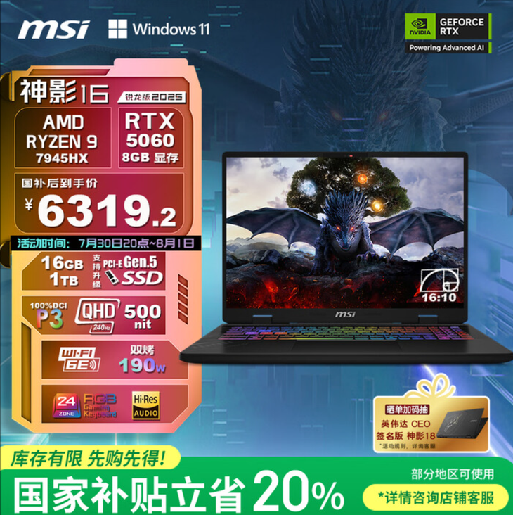 暑期来临,对于喜欢玩游戏的玩家们来说,现在终于有时间来好好的体验一下精彩的3A游戏大作,有了时间自然不能让设备拖后腿,如果你想要畅玩3A游戏大作,那么自然少不了一台高性能的游戏本,比如即将发售的微星神影16锐龙版2025,不仅采用了R9-7945H处理器,并且搭载RTX5060笔记本电脑GPU,叠加国补之后到手价仅6319.2元,非常值得推荐。