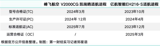 eVTOL想要跑通商业化,需要取得“适航三证”,即型号合格证(TC)、生产许可证(PC)和单机适航证(AC)。“适航三证”被视作民用飞行器正式商用的通行证。目前,亿航智能EH216-S已集齐TC、PC、AC和运营合格证(OC),峰飞航空V2000CG凯瑞鸥也获得了TC、PC和AC证件。