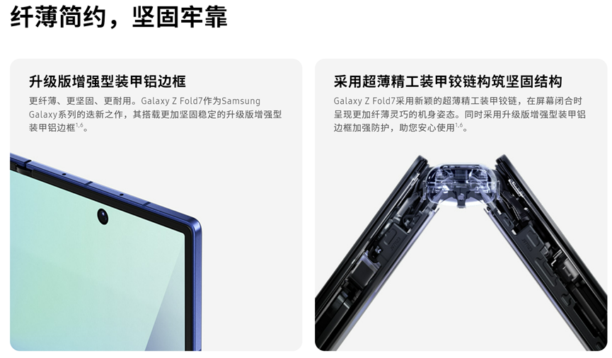 纤薄简约但坚固牢靠,Galaxy Z Fold7作为Samsung Galaxy系列的迭新之作,搭载更加坚固稳定的升级版增强型装甲铝边框。同时采用新颖的超薄精工装甲铰链,在屏幕闭合时呈现更加纤薄灵巧的机身姿态。