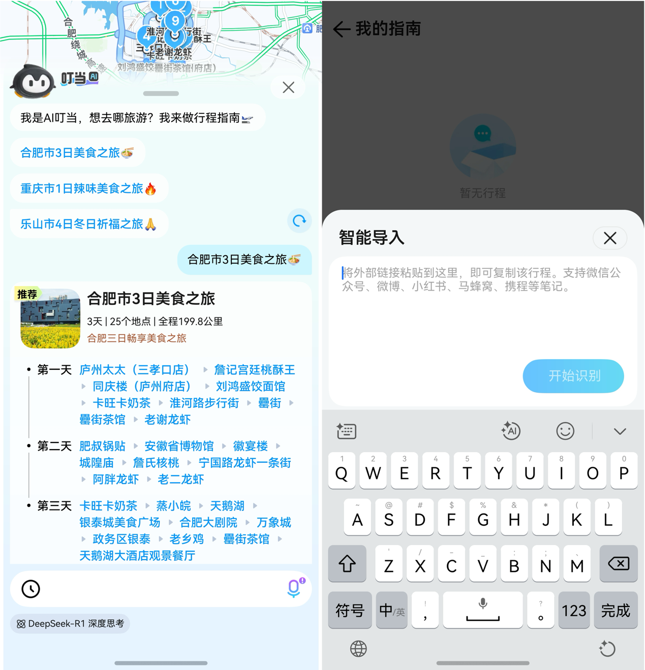 ·AI旅游攻略:过去在10余个平台间切换、复制粘贴信息的“攻略焦虑”,如今被“一站式智能定制”取代:首页下滑进入“行程指南”,即可获取海量现成攻略;点击“+”与“AI叮当”对话,3分钟内生成贴合用户偏好的行程;导入其他平台链接,系统自动解析信息并生成带导航点的攻略,直击旅游规划的痛点。
