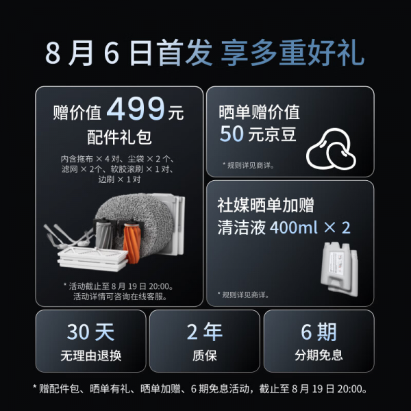 截至7月24日18点,大疆扫地机器人预约人数已超过1.4万人,市场热度可见一斑。参与0元预约的用户,还可在正式购买后额外获得价值499元包含拖布、尘袋、滤网等在内的配件礼包;参与晒单活动赠送价值50元的京豆;社媒晒单加赠2瓶400ml清洁液。同时可享30天无理由退换、2年质保、6期分期免息等权益。