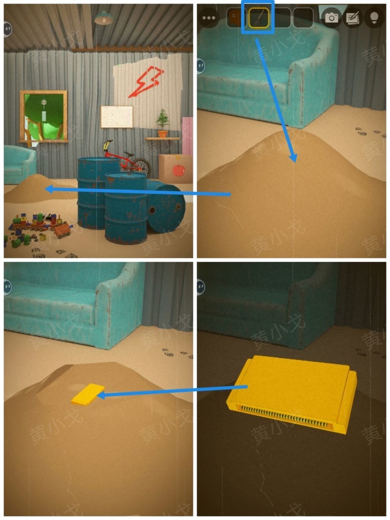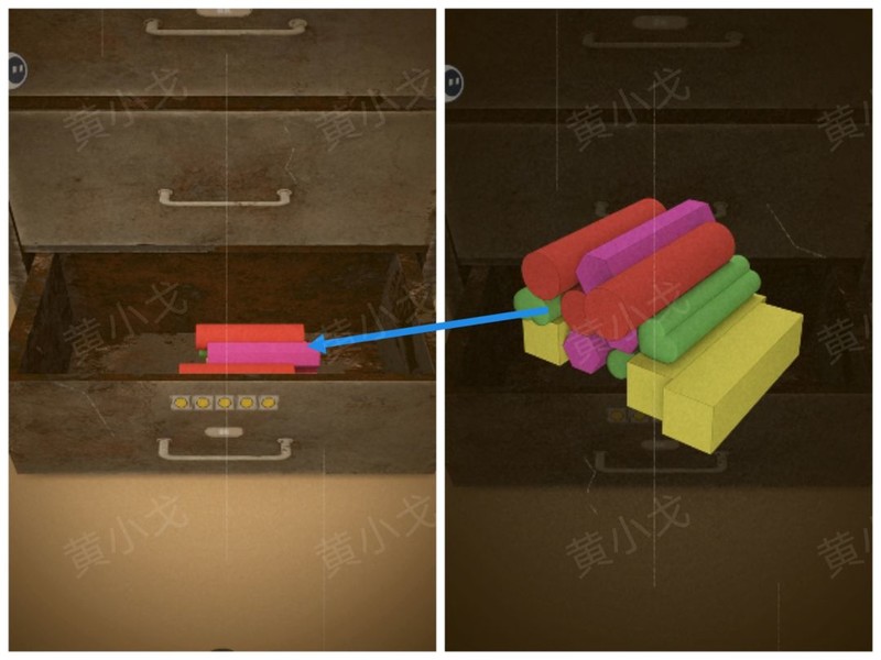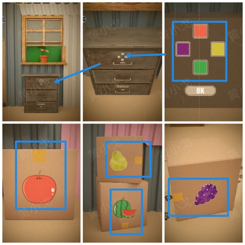 点击柜子第一个抽屉的密码锁,依据各场景纸箱上的图案线索调整密码。