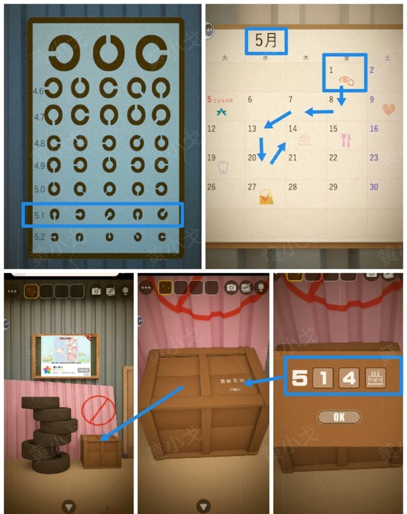 点击轮胎旁的箱子,依据视力表和日历线索调整密码锁。