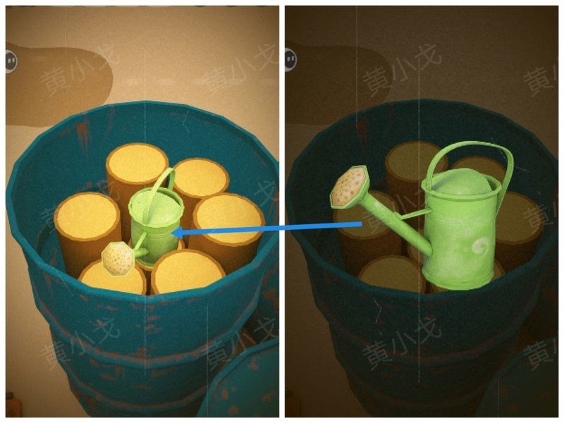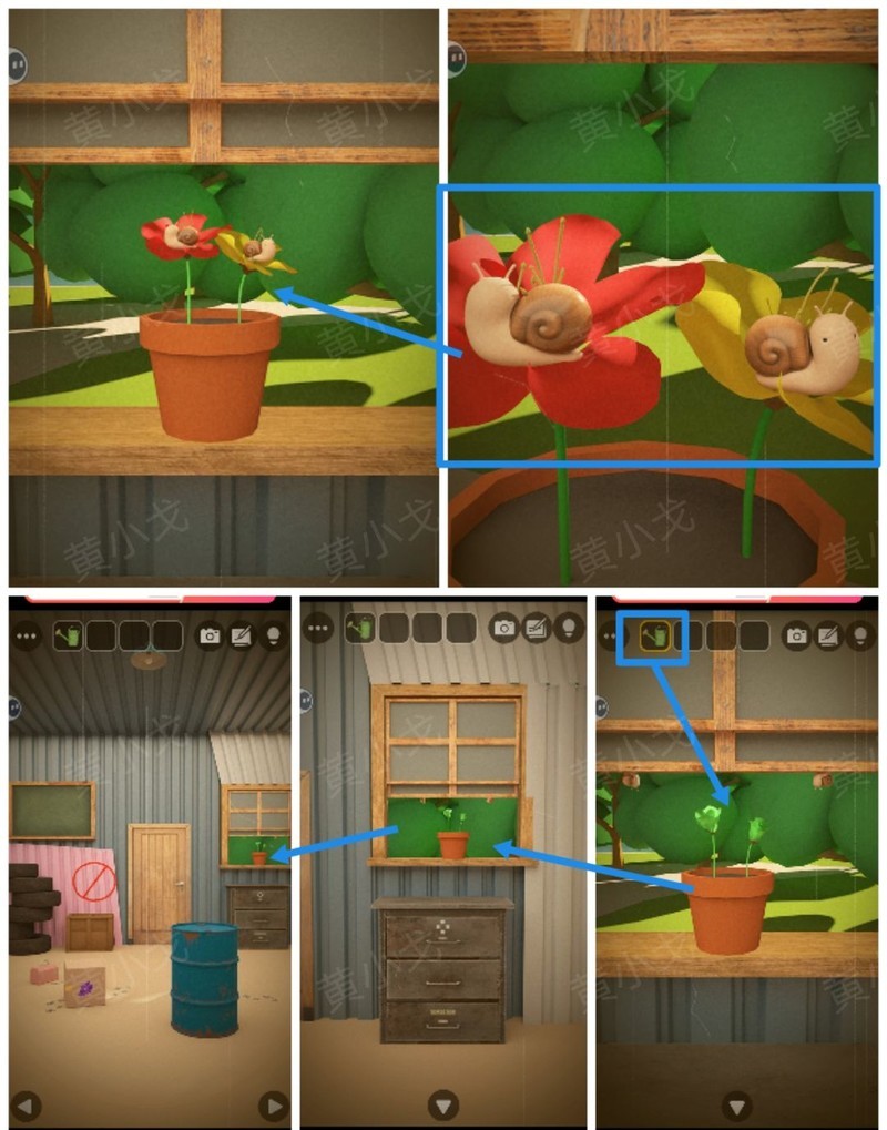 点击窗台盆栽,用水壶浇花,花开引蜗牛,获取线索。