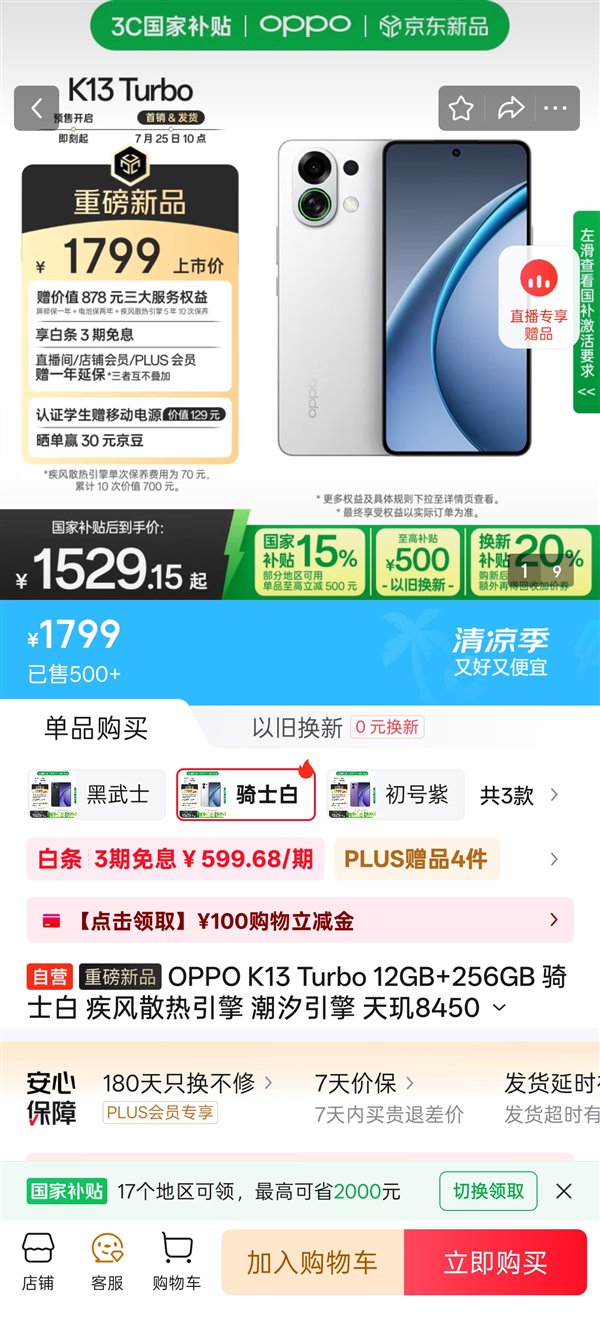 快科技7月25日消息,OPPO K13 Turbo将在今天10点正式发售,起售价是1529.15元(国补后的价格)。