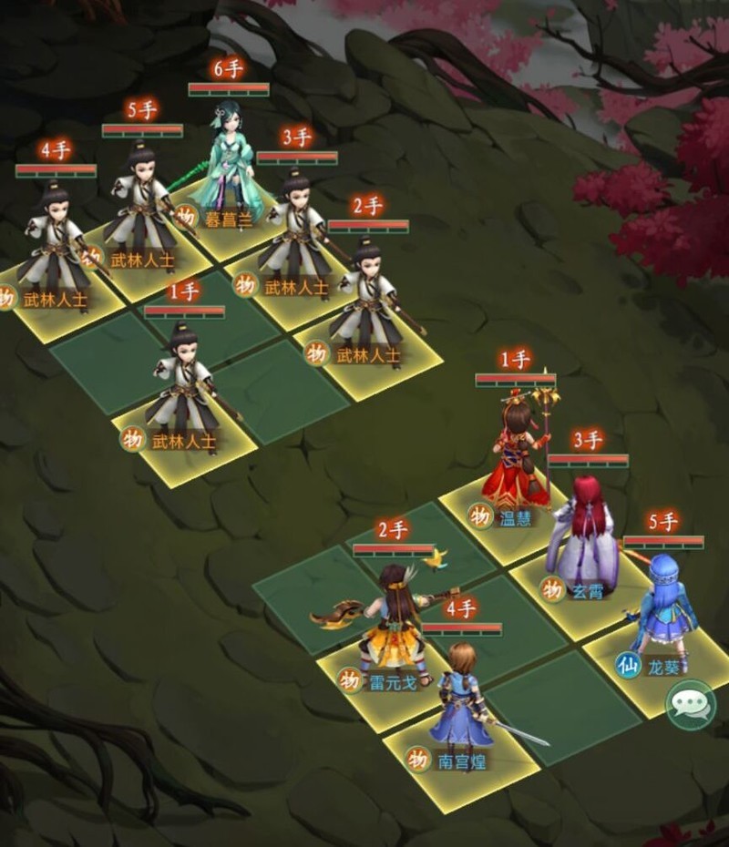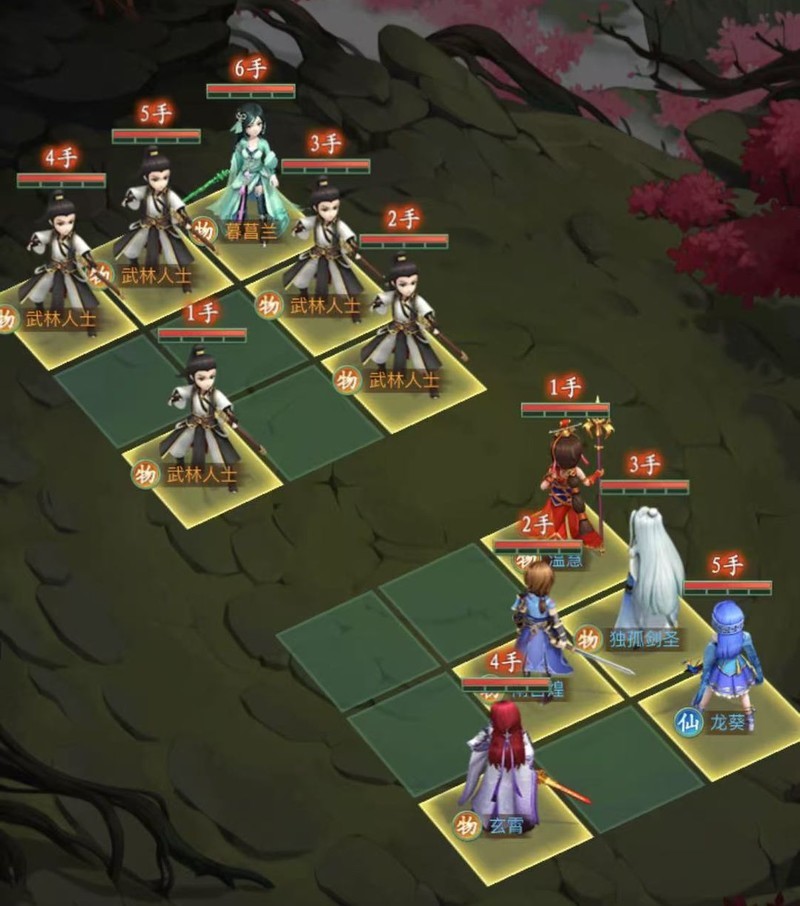 玄霄放在7号位,主要作用是分担左侧武林人士的伤害,并降低对方前排血量。当南宫煌与独孤剑圣释放绝技清理掉后排敌人后,可直接对暮菖兰发动绝技攻击。