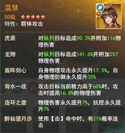 温慧位于3号位,主要作用是通过普攻虎袭对纵向敌人造成伤害,攻击时有21%概率触发连击。在战斗前中期,可协助队友削减右侧敌方人物的精气,为龙葵的技能攻击创造条件,使其对暮菖兰造成更高伤害。