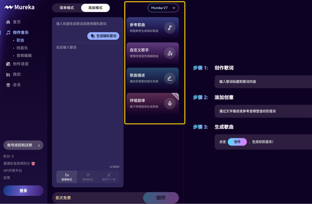 这次全新升级的Mureka V7,带来了更好的音乐品质,大幅提升旋律动机与编曲质量,人声与乐器真实度进一步增强,做出来的每一首歌都好听;以及更强的音乐创新性,生成的歌曲对于音乐从业者更具启发。
