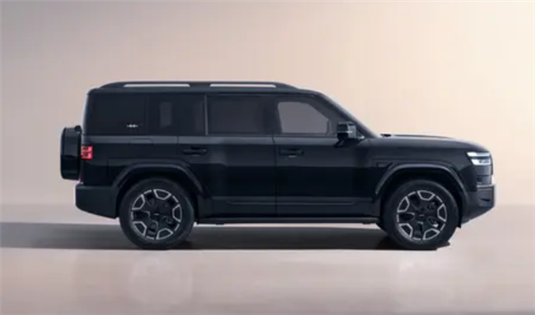 车侧设计简洁,车门内凹,配备常规门把手、方形外后视镜,D 柱有品牌标识。
