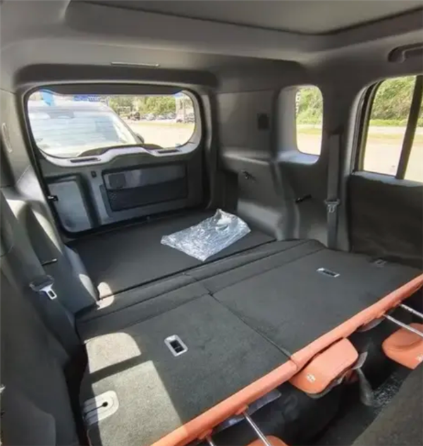 后排座椅支持 4/6 比例放倒,可与后备厢形成纯平空间,车内还配备 4 个天空音响,后备厢内有挂钩、12 伏电源和 220 伏电源。
