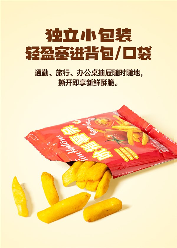 独立小包装,轻盈塞进背包 / 口袋,通勤、旅行、办公桌抽屉随时随地,撕开即享新鲜酥脆。