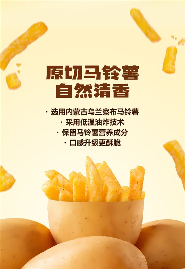 选用内蒙古乌兰察布马铃薯,采用低温油炸技术,保留马铃薯营养成分,口感升级更酥脆。