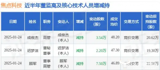 2025年1月24日焦点科技高管成俊杰、董秘,董事迟梦洁、董事,高管顾军共减持公司股份13.24万股,占公司总股0.0417%。其中顾军减持7.5万股,是三人中减持最多的一位。截止到目前,顾军共持有焦点科技22.5万股。