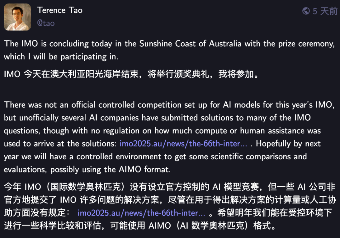 他同样也对在 IMO 取得成绩的 AI 模型十分关注。