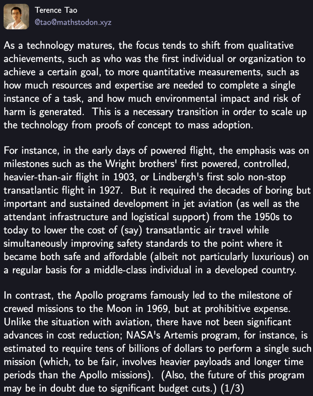 相比之下,阿波罗计划虽曾在 1969 年成功实现了载人登月的里程碑,但代价极为高昂。与航空领域的发展不同,太空探索在成本降低方面并未取得显著进展。