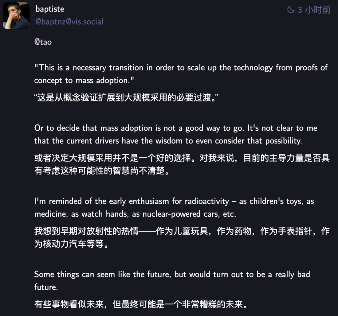 陶哲轩教授的观点站在了历史的角度,但同样也有网友回望历史而对人工智能的普及暗含的风险而表示担忧。