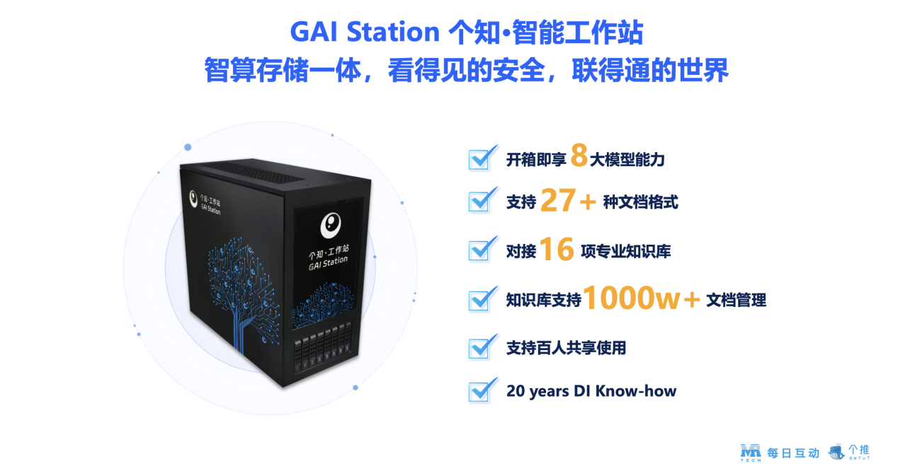 当前,大模型从技术热点迈向产业应用,真正的挑战浮出水面:高昂的私有化部署成本令人却步,云端调用又使敏感数据如履薄冰。企业渴望深度融入大模型能力,却常遭遇“水土不服”。如何将海量、分散的企业数据安全高效地转化为智能生产力?每日互动推出GAI Station个知·智能工作站,基于20年数据智能服务经验与行业Know-How,深度融合“大数据+大模型”,为企业提供看得见的安全保障与高效的数据联通,让宝贵的数据释放澎湃的价值。