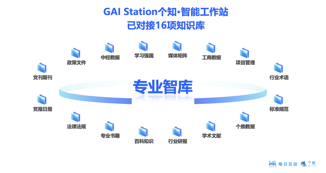 企业在业务增长、行业研判、市场营销等场景时,仅有内部数据是远不够的,还需要更多的行业知识、产业智慧等,帮助企业掌握行业动态,更好的应对市场变化。GAI Station已预置对接了16大权威专业知识库(包含媒体新闻、法律法规、政策文件、金融经济、标准规范等),企业可按需快速调用以满足行业决策。同时,GAI Station还支持企业自定义接入的垂类知识库,再结合每日互动20年数据智能服务经验,就能够快速帮助企业对接行业知识,搭建智能应用,辅助市场决策,赢取行业机会。
