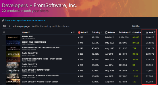 这一成绩甚至超过了FromSoftware旗下的《黑暗之魂3》(近13万)和《只狼:影逝二度》(12.5万)。