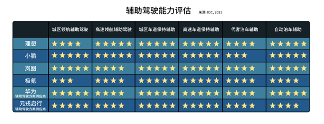 从IDC统计的辅助驾驶能力评估图表上可以看出,各家厂商在不同应用场景下的能力存在一定差异。其中,高速场景整体差距较小,理想、小鹏、极氪、华为、元戎启行等厂商普遍具备较强的高速NOA与车道保持能力,表现趋于成熟。