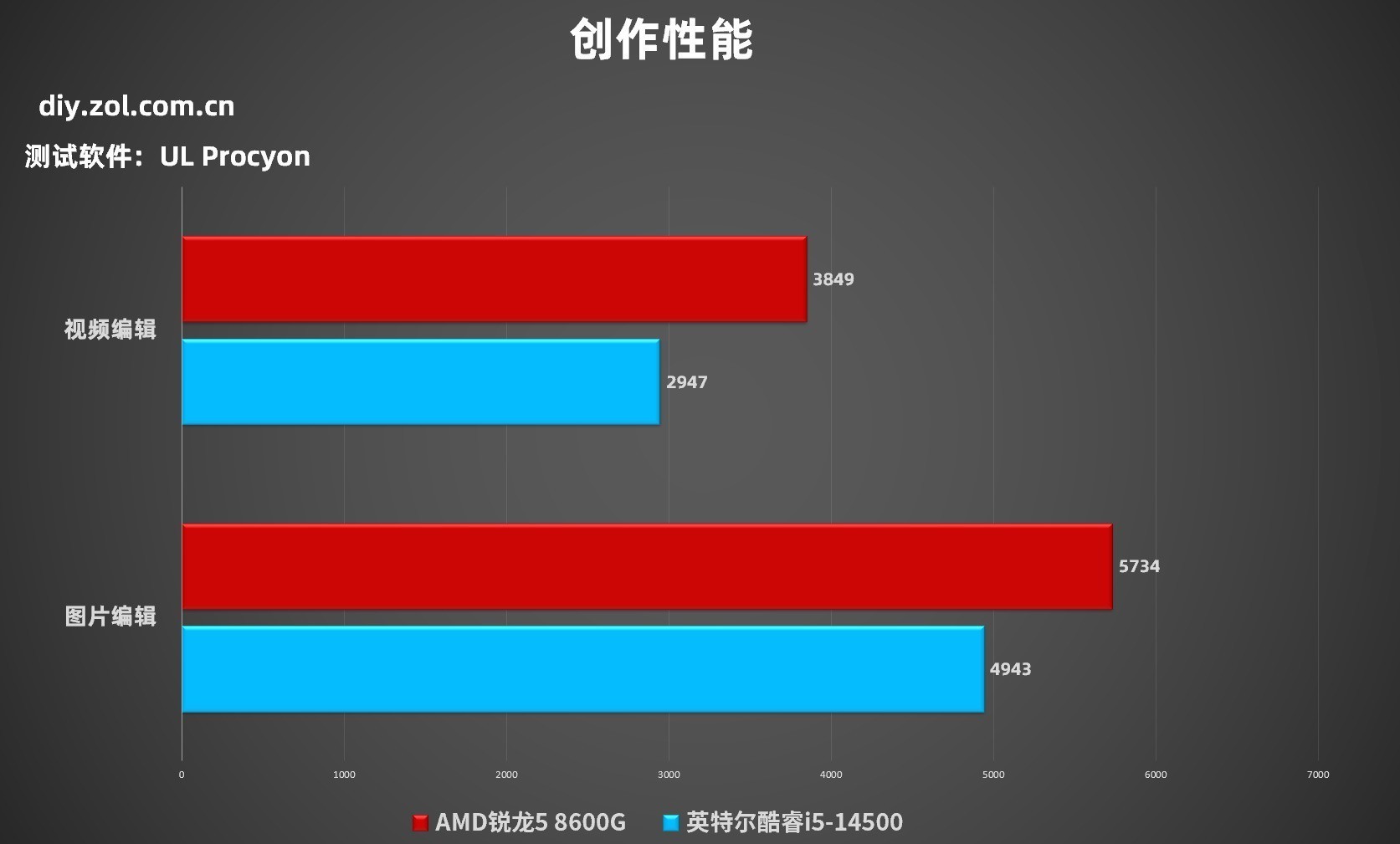 AMD锐龙5 8600G虽然核心线程总数不如异构设计的英特尔酷睿i5-14500。但因为保持了全大核,同时主频更高,加速频率也达到了5GHz,并且拥有先进成熟的Zen4架构。所以在UL Procyon测试中不管是Premiere Pro的视频编辑测试,还是Photoshop、Lightroom Classic图片编辑测试,分数成绩均领先于英特尔酷睿i5-14500平台。对于经常使用Adobe软件的公司而言,AMD 锐龙5 8600G平台拥有更快的视频渲染输出、更流畅的图片批量处理以及更高效的多任务操作体验。选择搭载锐龙5 8600G的平台,意味着能更快地完成Adobe创作任务,从而提升企业整体工作效率。所以与上面PC MARK的测试一样,在这些重负载的生产力软件上也更体现出了全大核设计的重要性,英特尔酷睿i5-14500的混合架构带来的核心线程数量优势,并没有转化成性能优势,反而会因为调度等问题收到拖累,最终不敌锐龙5 8600G。
