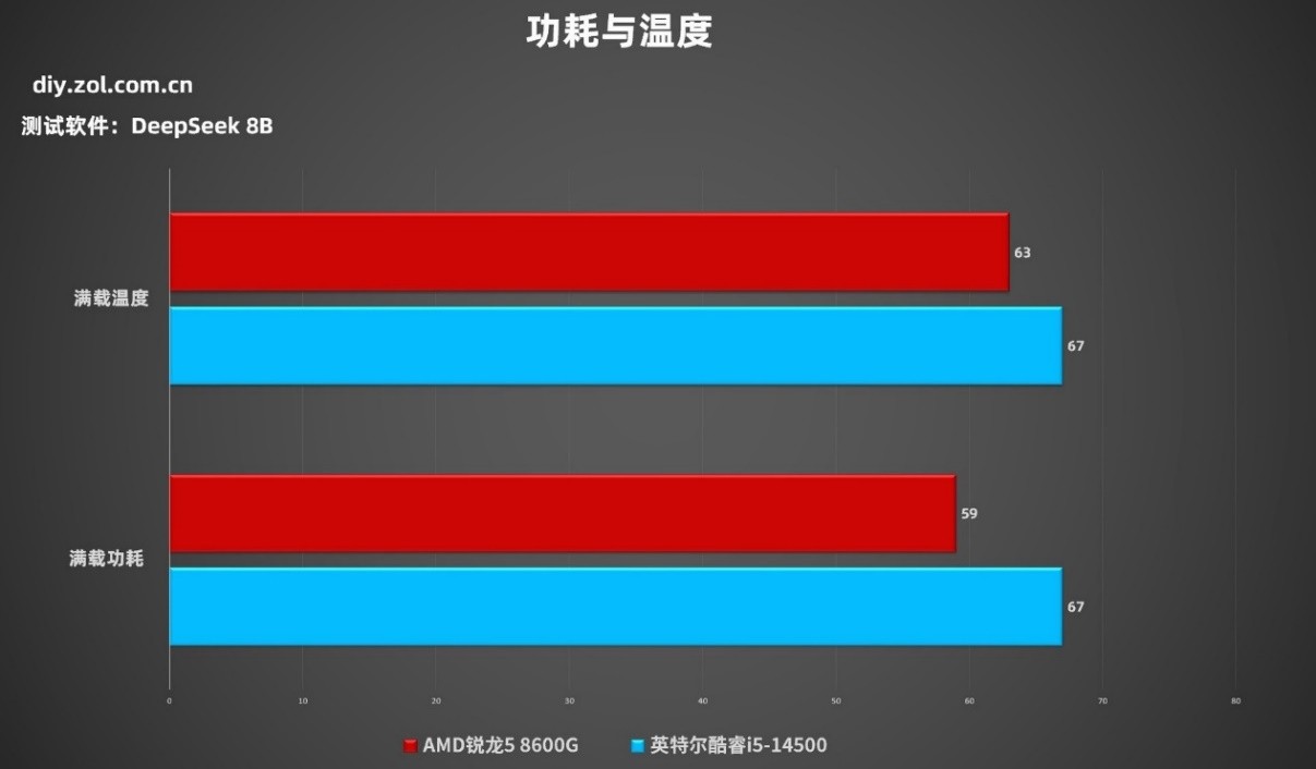 得益于NPU以及先进Zen4架构的支持,拥有更高本地大模型计算效率的AMD 锐龙5 8600G平台,在功耗和温度上都更胜英特尔酷睿i5-14500一筹。因此如果企业又长期负载的AI任务,AMD 锐龙5 8600G平台的功耗和发热更低,长期运行稳定性更高,同时节省用电成本。