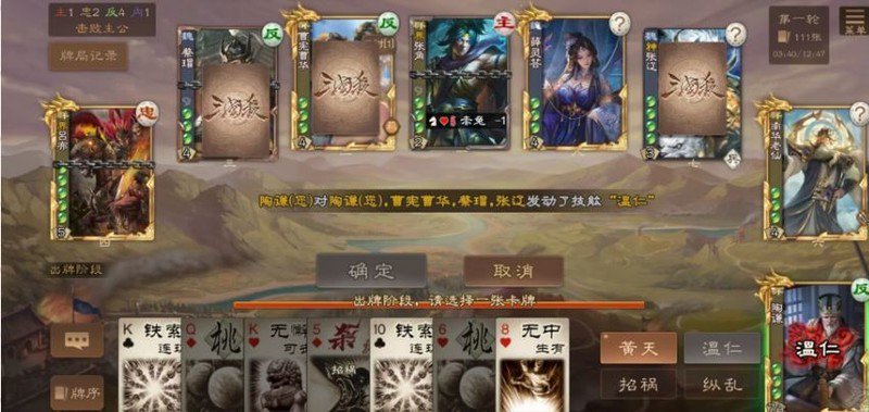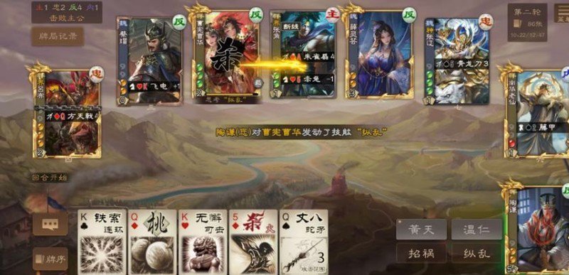 本局中,陶谦每回合通过纵乱和招祸限制主公,逐步打开局势,为胜利奠定基础;招祸牌不仅提升爆发力,也成为击杀主公的关键。从第一回合便可见温仁强大的补牌能力。