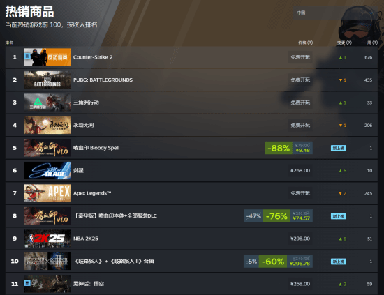 截至发稿前,除去免费游戏后,《嗜血印》已经登顶Steam国区热销榜,《嗜血印》的豪华版(游戏本体+全部服装DLC)则在国区热销榜里排名第三。