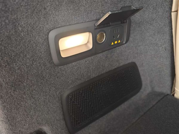后备箱左侧则配备了点烟器和250V插板,用户能够直接插入插排引线使用,适合露营、烧烤等场景。相较其它品牌,省去了从交流充电口插外放电插板这一步骤。