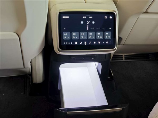 而二排小屏幕下方为乐道L90配备的冷暖冰箱,最大容量8.8升,支持0-50摄氏度储藏,箱门也是电动开合。
