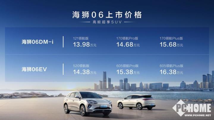 比亚迪海洋网全新中型SUV海狮06正式上市,海狮06DM-i官方指导价为13.98万元-15.68万元、海狮06EV官方指导价为14.38万元-16.38万元。