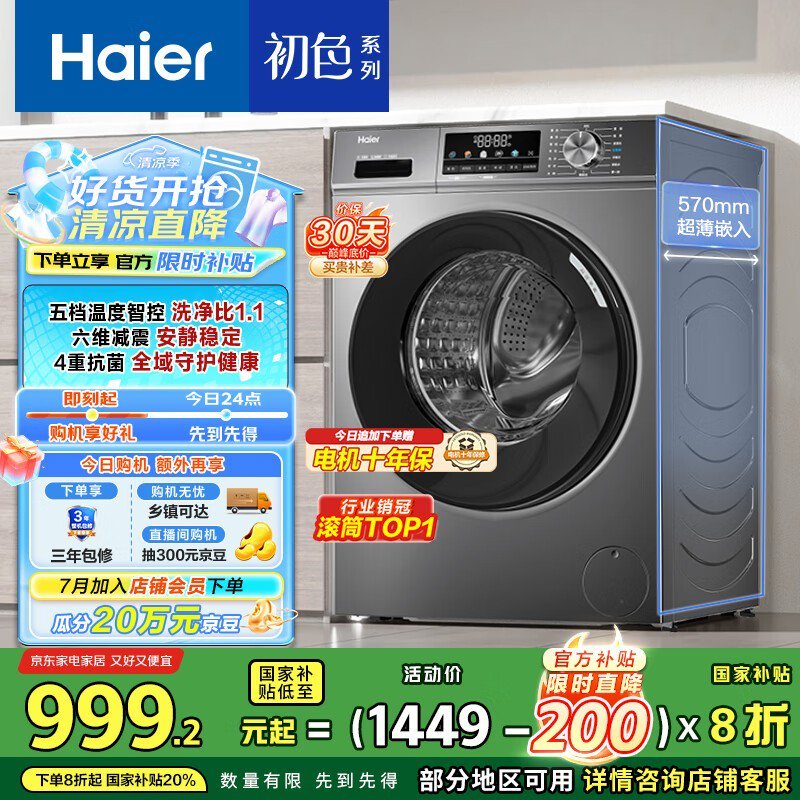 海尔初色10kg滚筒洗衣机999元