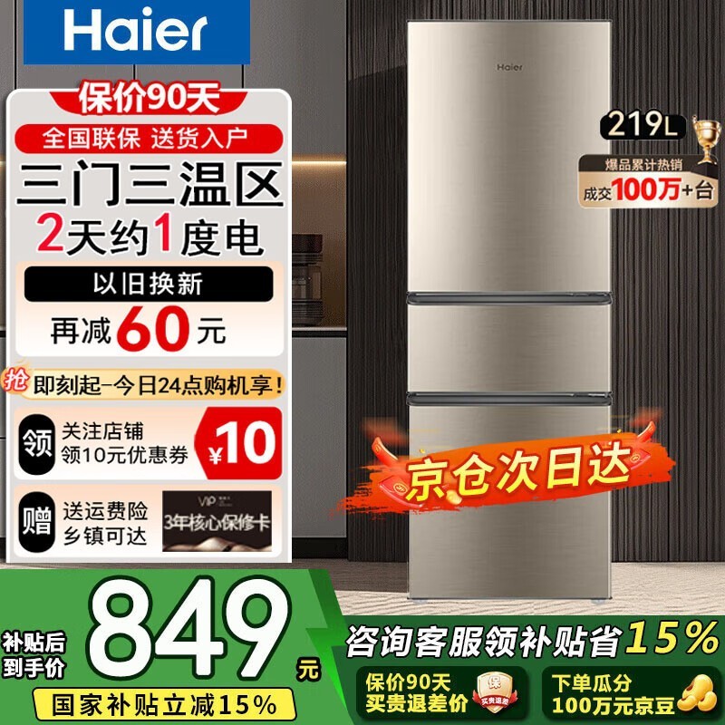 海尔三门迷你冰箱849元