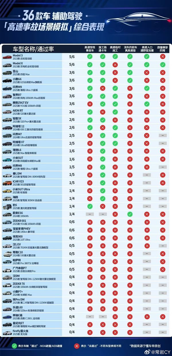 此前,懂车帝36款车辅助驾驶实测显示,无论是高速还是城市事故场景模拟,没有一家车企的辅助驾驶系统能够完美通过所有测试项目,不过特斯拉在一众车型中表现最为突出。