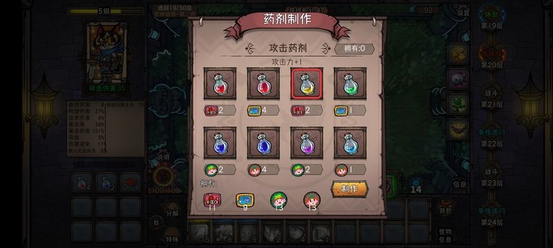 药剂分为红蓝两种,各具小中大规格,但更关键的是四种属性药:增强攻击、魔力、生命与魔力上限。